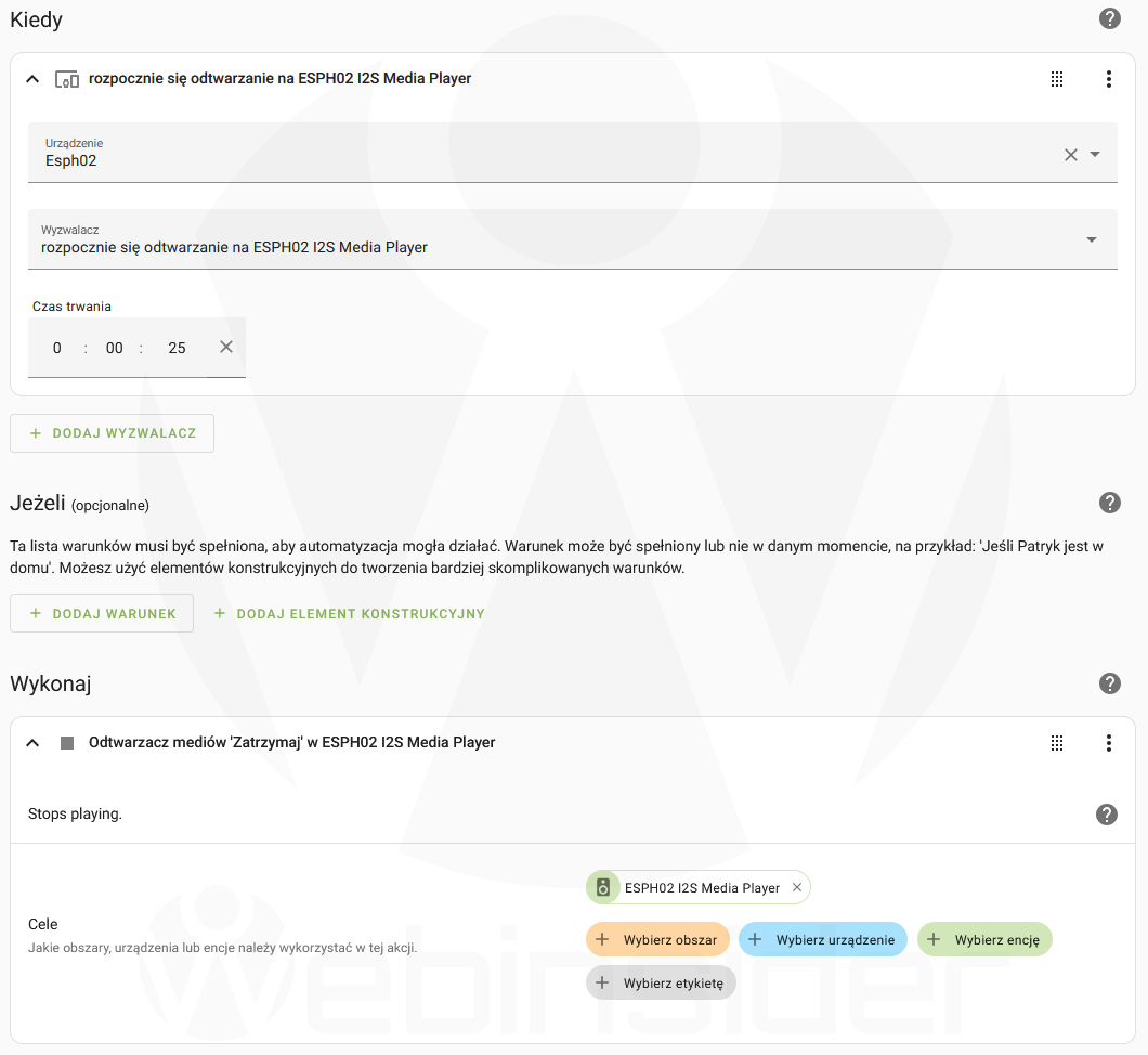 Utworzyłem automatyzację, której wyzwalaczem jest rozpoczęcie odtwarzania na konkretnym odtwarzaczu mediów (ESP32 z ESPHome i I2S), która ma zostać wyzwolona po zdefiniowanym czasie – 5, 10, 20, 30 sekund… To zależy od tego, jak długie komunikaty są zazwyczaj odtwarzane, tak by nie przerwać w trakcie.